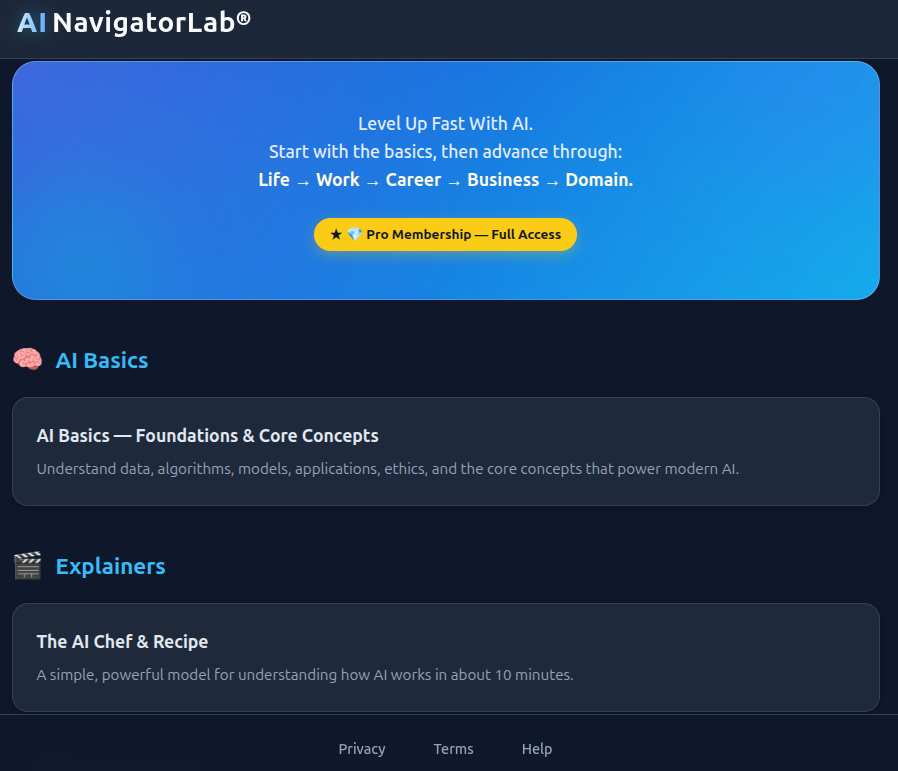 AINavigatorLab® is an all-in-one AI learning and productivity app designed to help beginners, professionals, entrepreneurs, and domain experts learn to use AI smarter in daily life, work, career, business, and specialized fields. Built as a fast app, AINavigatorLab gives users a complete, structured path to mastering AI —without needing technical experience.